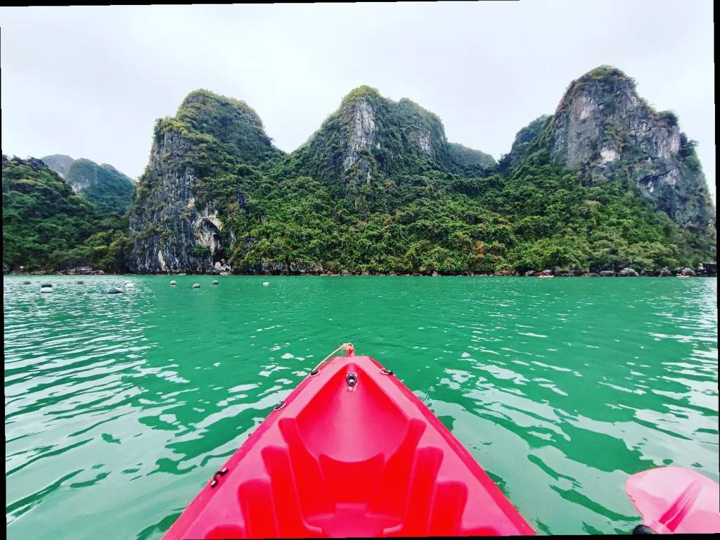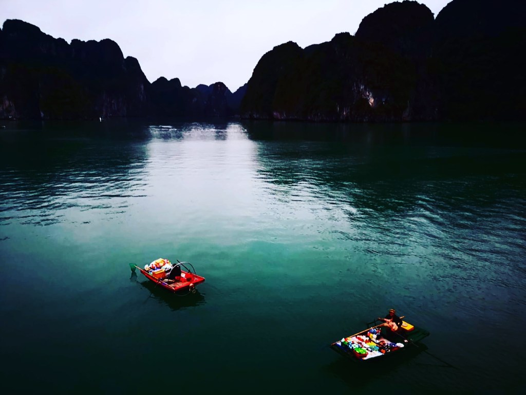 Halong Bay, nord del Vietnam. Un luogo magico… Mi ha commossa nel profondo. Miriadi di isolette, faraglioni e rocce ricoperte di giungla nel lussureggiante golfo di Tonchino. Abbiamo fatto una crociera di due giorni su un’antica giunca cinese restaurata. Abbiamo fatto kayak, assistito alla pesca dei calamari di notte, fatto escursioni sugli isolotti, Tai Chi all’alba, un corso di cucina vietnamita (squisiti gli involtini di riso e verdure!) e siamo anche entrati in un’enorme grotta sotterranea sperduta nel nulla! Quanta bellezza c’è su questo nostro generoso pianeta… più di quanto immaginiamo…