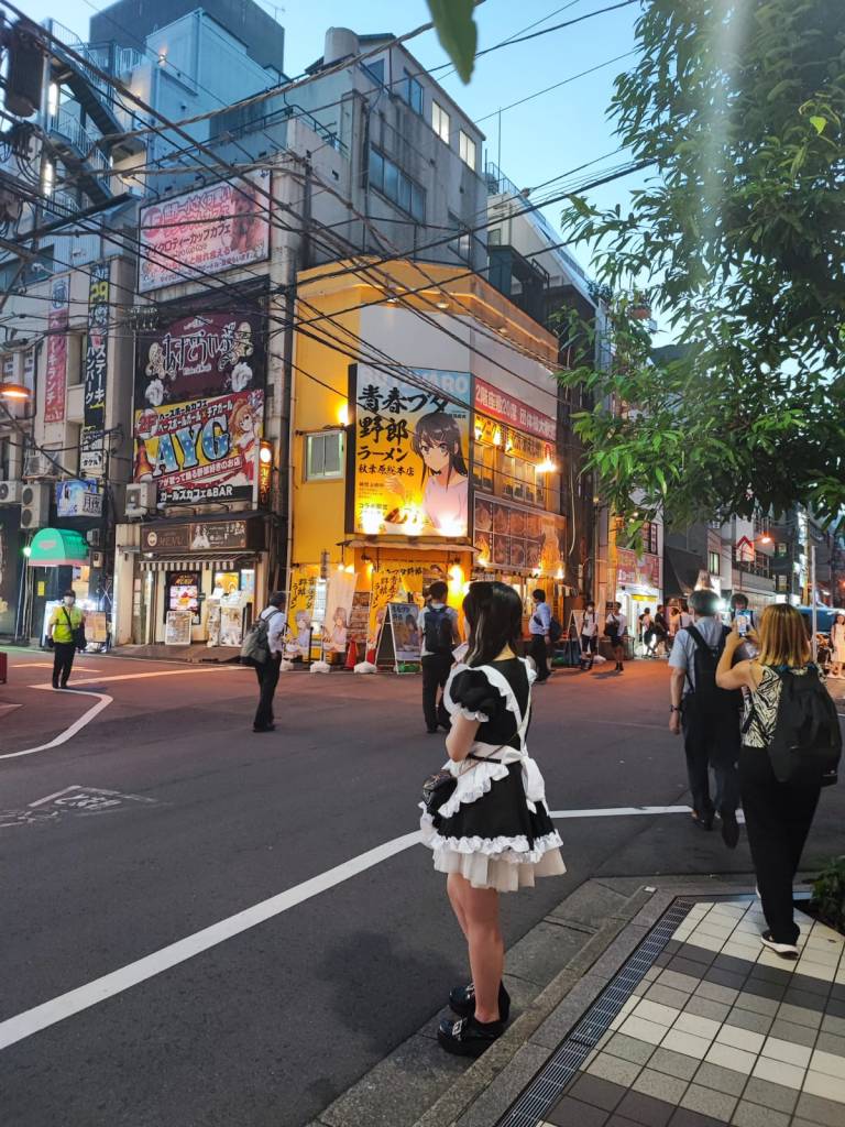 - Dicevo, non tutti i giapponesi si vestono di bianco e nero e camminano a testa bassa o siedono con le mani giunte sul grembo. No, ci sono anche i giapponesi modaioli, quelli degli eccessi e delle stravaganze, quelli che si ispirano ai personaggi anime e manga della loro potente cultura artistica, quelli che seguono le mode del k-pop, del kuwaii, delle lolita e le maid in miniatura, i giapponesi otaku, appassionati di manga, che vanno in giro per il celebre quartiere di Akihabara su altissimi scarponi neri, con trucco pesante, capelli multicolore e abiti all’ultima moda.
