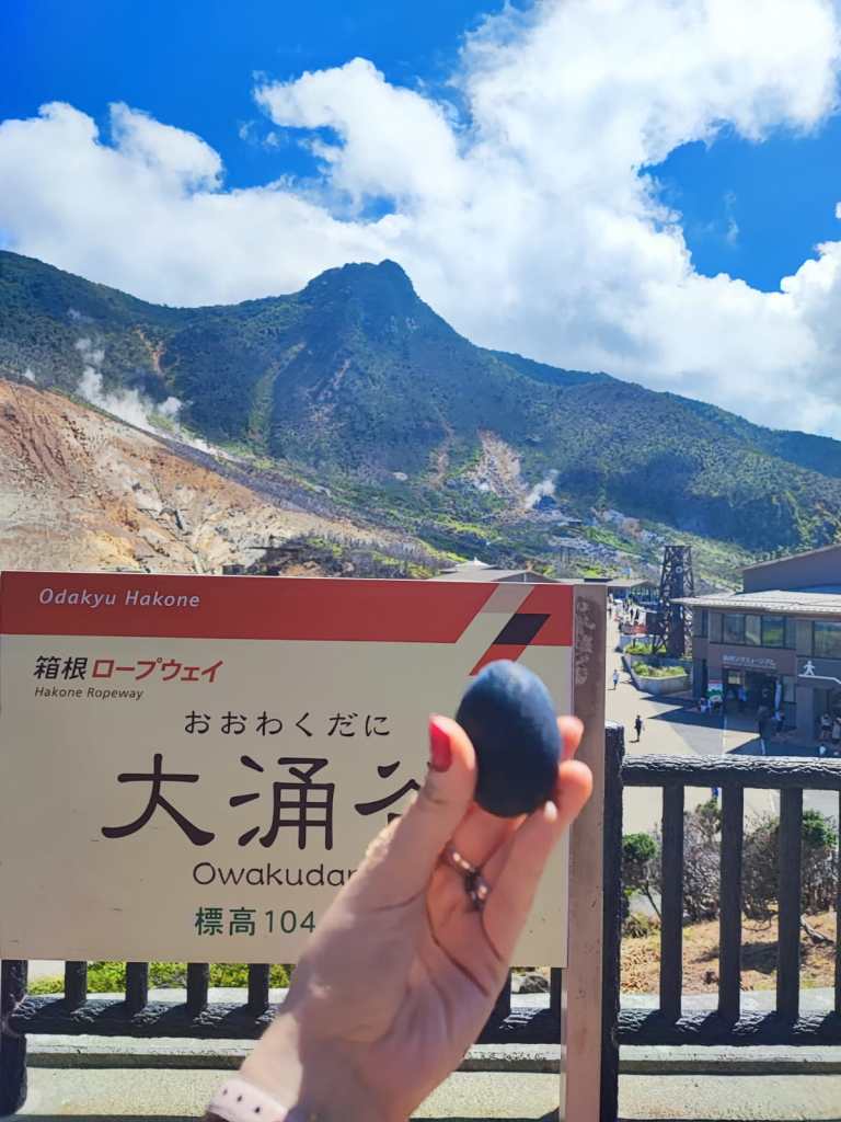 - Una folle avventura nella valle vulcanica dell’Owakudani: saliamo sulla funivia dopo infiniti treni, metro e scarpinate. Una signora giapponese, mentre saliamo verso la vetta a bordo di una cabina della funivia, ci dice che ha sentito che a breve chiuderanno la funivia poiché dal sud del Giappone sta arrivando un thunderstorm. Le hanno detto di sbrigarsi a salire prima che chiudessero la linea. Mentre saliamo il vento si fa sempre più forte. Non facciamo in tempo ad arrivare in cima e scendere dalla cabina che salta la luce e tutto si blocca. La funivia è ferma e noi, che siamo scesi per un pelo, ci ritroviamo bloccati sul vulcano. Quelli rimasti su devono aspettare che gli addetti li tirino su a mano. Alla fine, scendono anche loro sulla terra sulfurea. L’acre odore di zolfo è fortissimo, si vedono colonne di fumo e colorazioni gialle, arancioni, verdi e nere sul terreno. Un paesaggio di rocce, foreste bruciate e fumarole ci avvolge. Assaggiamo le uova nere cotte nella cenere vulcanica, è tutto quello che offre il convento per pranzo e io non lo sento neppure il sapore di zolfo. Per fortuna prima di salire mi ero mangiata un ottimo gelato artigianale alla patata dolce e al pomodoro all’Open Air Museum. La tensione nel gruppo è alle stelle, ma io con i miei compagni di viaggio mi diverto come non mai. Ogni disavventura è un’avventura, adoro gli imprevisti, le situazioni inaspettate, le sorprese, purché non capiti niente di grave ovviamente. La funivia non riapre e le file per gli autobus che riportano a valle sono troppo lunghe, così ci incamminiamo a piedi. Ci tocca un’ora e passa di trekking sotto al sole sulla strada e per sentieri accidentati. Alla fine arriviamo distrutti, ma sani e salvi.