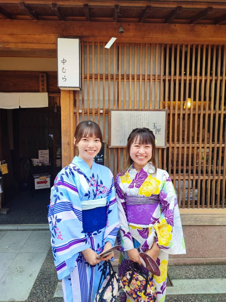- Non sono mai volgari le ragazze qui. Molte si vestono con kimono, ciabattine in legno e fard bianco, ma non sono vere geishe, quelle vere infatti, che ormai sono pochissime, si trovano nel quartiere Gion di Kyoto, ma purtroppo, io non ne ho viste.