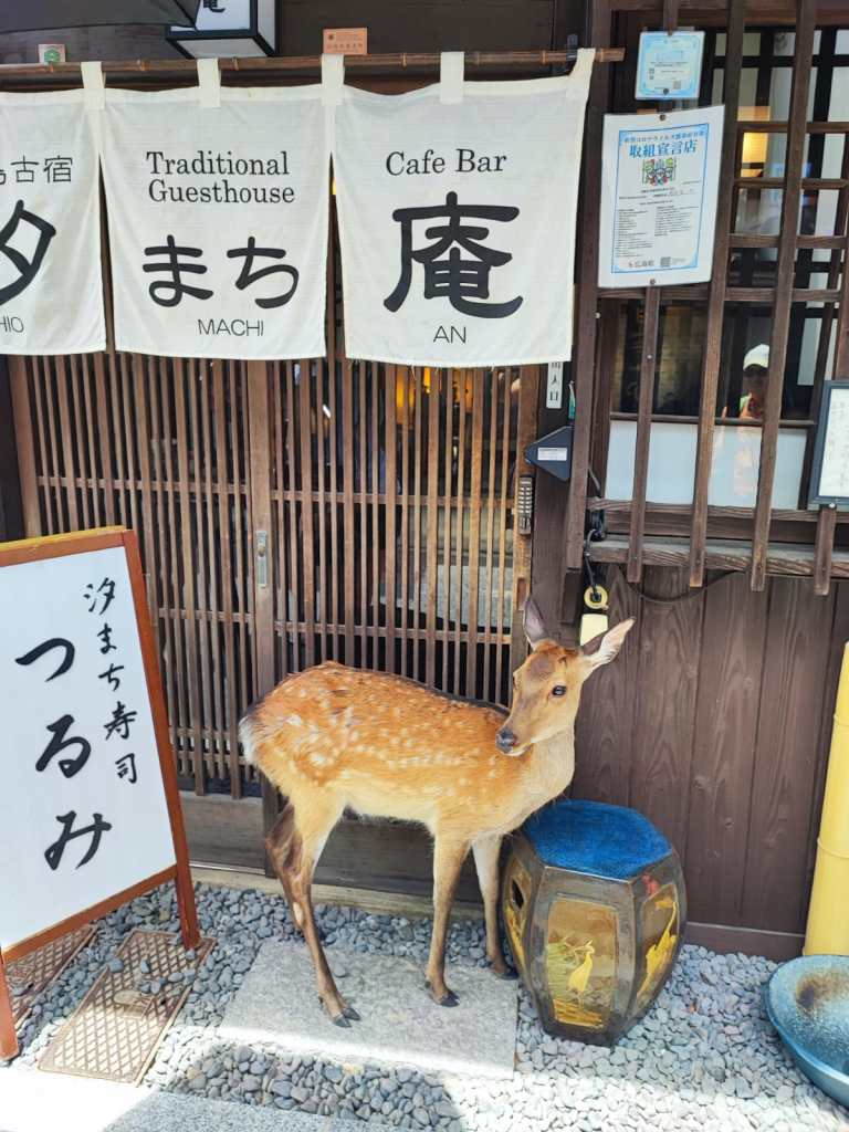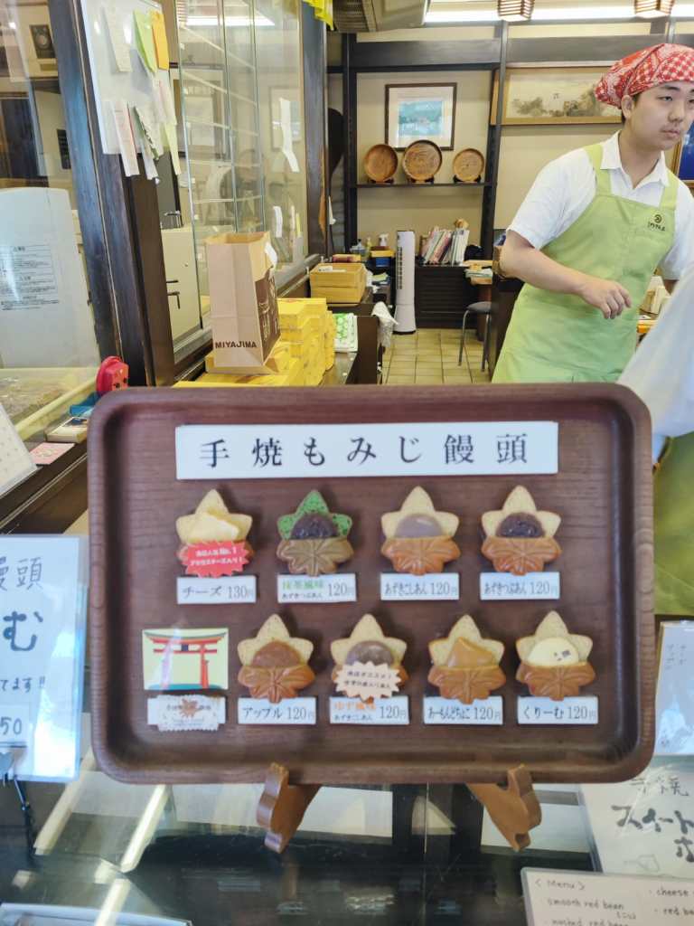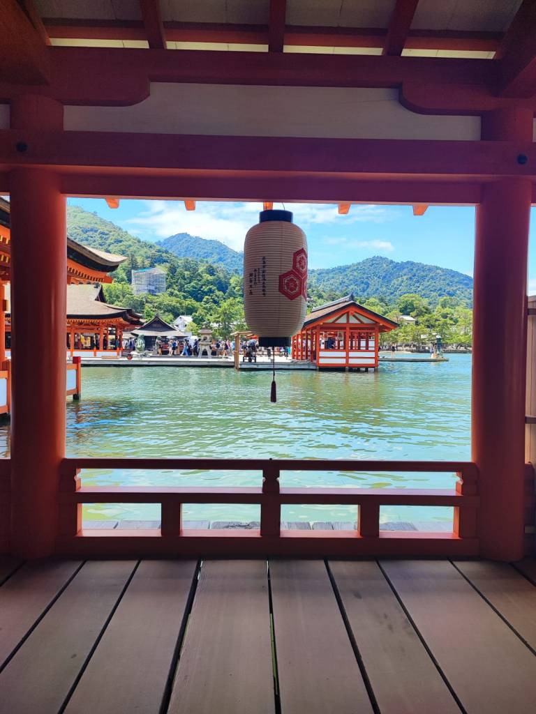 - L’isola di Myajima è: cerbiatti che ti rubano il cibo (anche le cotolette di maiale, una ragazza li definisce “bestie di satana” per il fatto che siano così invadenti e snaturati), e si fanno accarezzare, i mochi, i deliziosi dolcetti ripieni di pasta ai fagioli rossi a forma di foglia d’acero che ci gustiamo in un negozietto sorseggiando thè matcha freddo, un maestoso torii rosso immerso nell’acqua del mare finché c’è l’alta marea, dopo il tramonto invece è immerso nella fanghiglia ma ci si può camminare sotto, santuari shintoisti immensi in mezzo alla natura, funivia che ti porta sul cucuzzolo dell’isola e ti regala una vista mozzafiato sulle miriadi di isolotti circostanti, trekking nella foresta per scendere dal cucuzzolo e rigenerante bagno nel fiume dopo la sudata della giornata, con incontro ravvicinato con un bel serpente verde smeraldo.